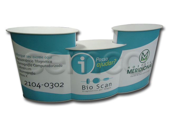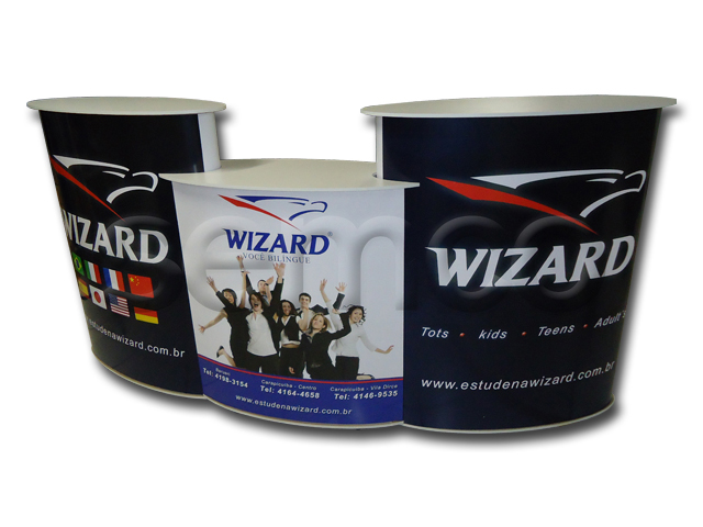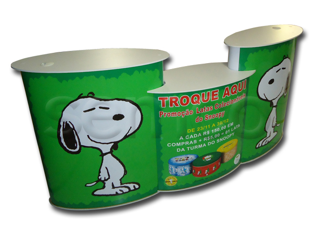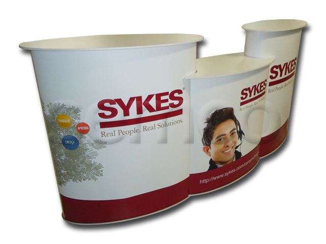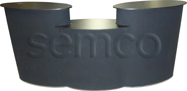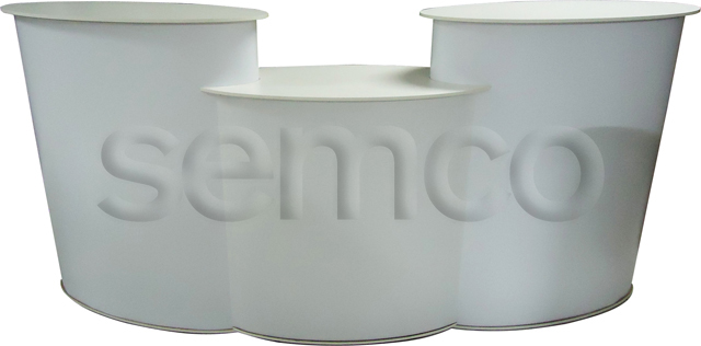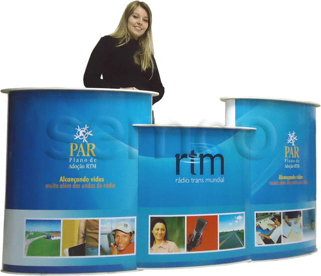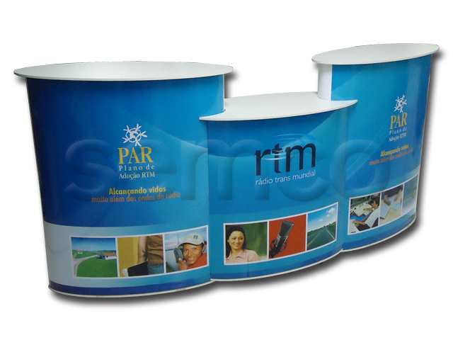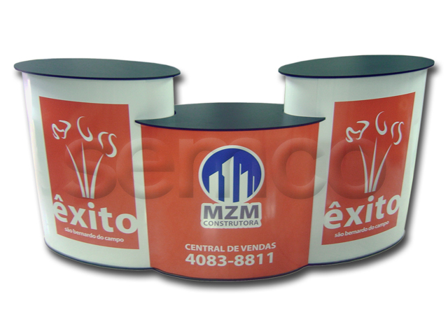 Tampo e base em MDF com acabamento texturizado preto ou branco (outras cores sob consulta), corpo do balcão em chapa de PSAI branca com revestimento em carpete (cor sob consulta) ou imagem adesivada. Caixa de papelão para