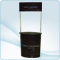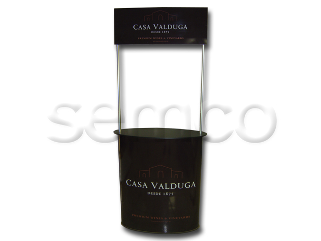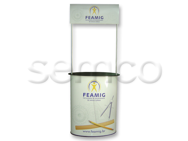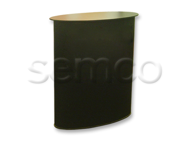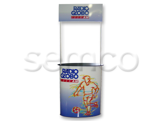 Tampo e base em MDF com acabamento texturizado preto ou branco (outras cores sob consulta), corpo do balcão em chapa de PSAI branca com revestimento em carpete (cor sob consulta) ou imagem adesivada. Acompanha prateleira