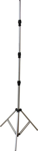 Porta banner convencional. Estrutura em alumínio fosco. Pés articulados e haste telescópica. Montagem sem